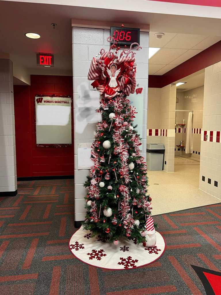 We stuck to the University of Wisconsin’s colors – red and white – and hand crafted a tree topper with their very own “angel”, Coach Mo, on the top!