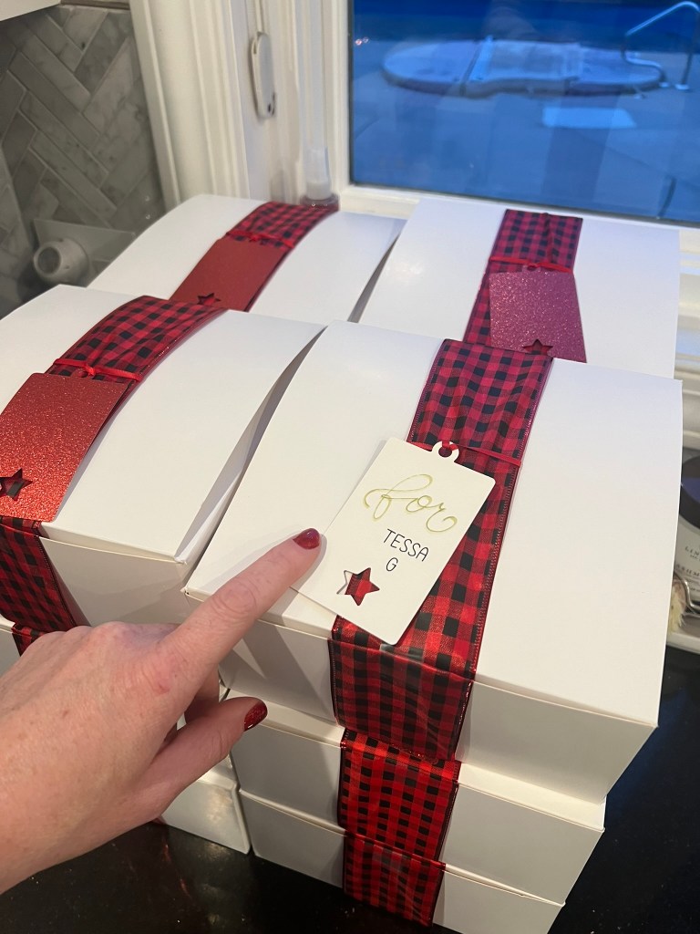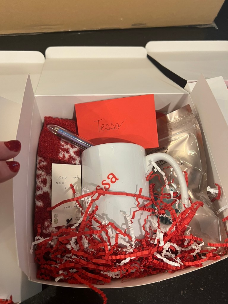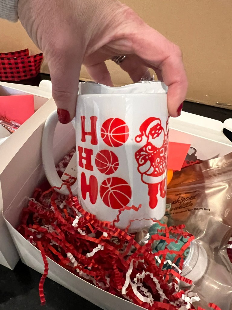 Each gift box contained a mug that I personalized with their name, a picture of Santa, and stylized with a “HO HO HO” where each of the Os were replaced with basketballs. I made these using my Cricut cutter, infusible ink, and Cricut mug press. Also inside were some cozy socks, lip balms and hand creams for these cold Wisconsin winters, a Starbucks gift card, and some sweet treats such as hot cocoa, peppermint stirrers, and Lindt chocolates.
