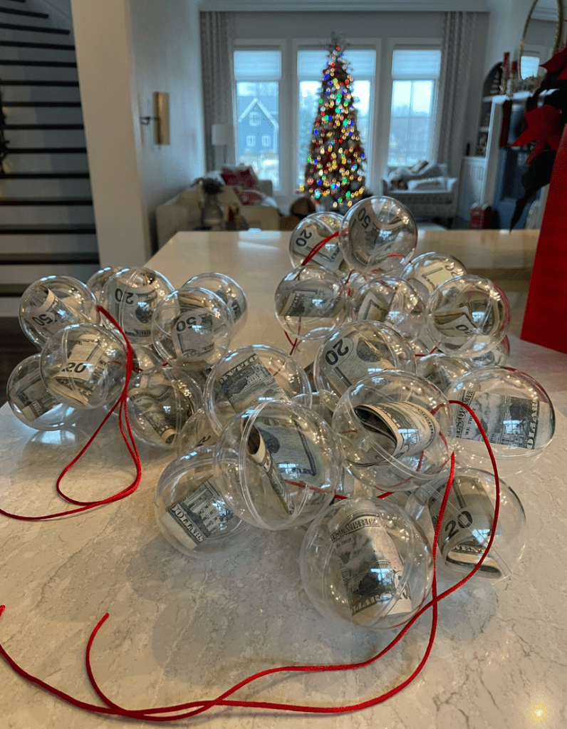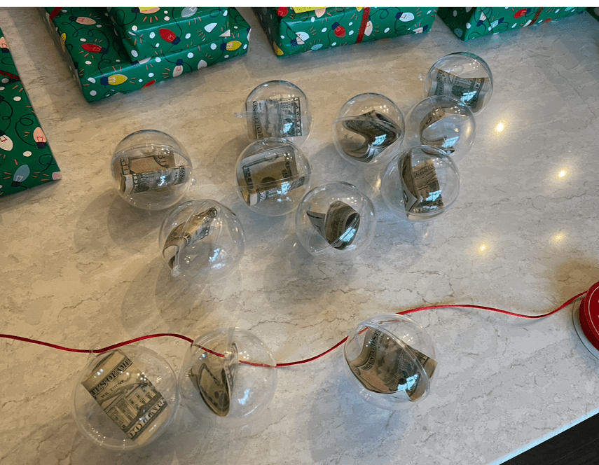 In keeping with the cash theme, last year I filled plastic ornaments that I found at Micheals with cash and strung them together into ornament bundles using ribbon. This was fun because it took them a bit longer to get to all of their cash as they had to unstring and open each ornament. My initial plan had been to personalize and decorate the ornaments using permanent marker but I ran out of time. You could also add more ornaments filled with candy or small items to go along with the cash.