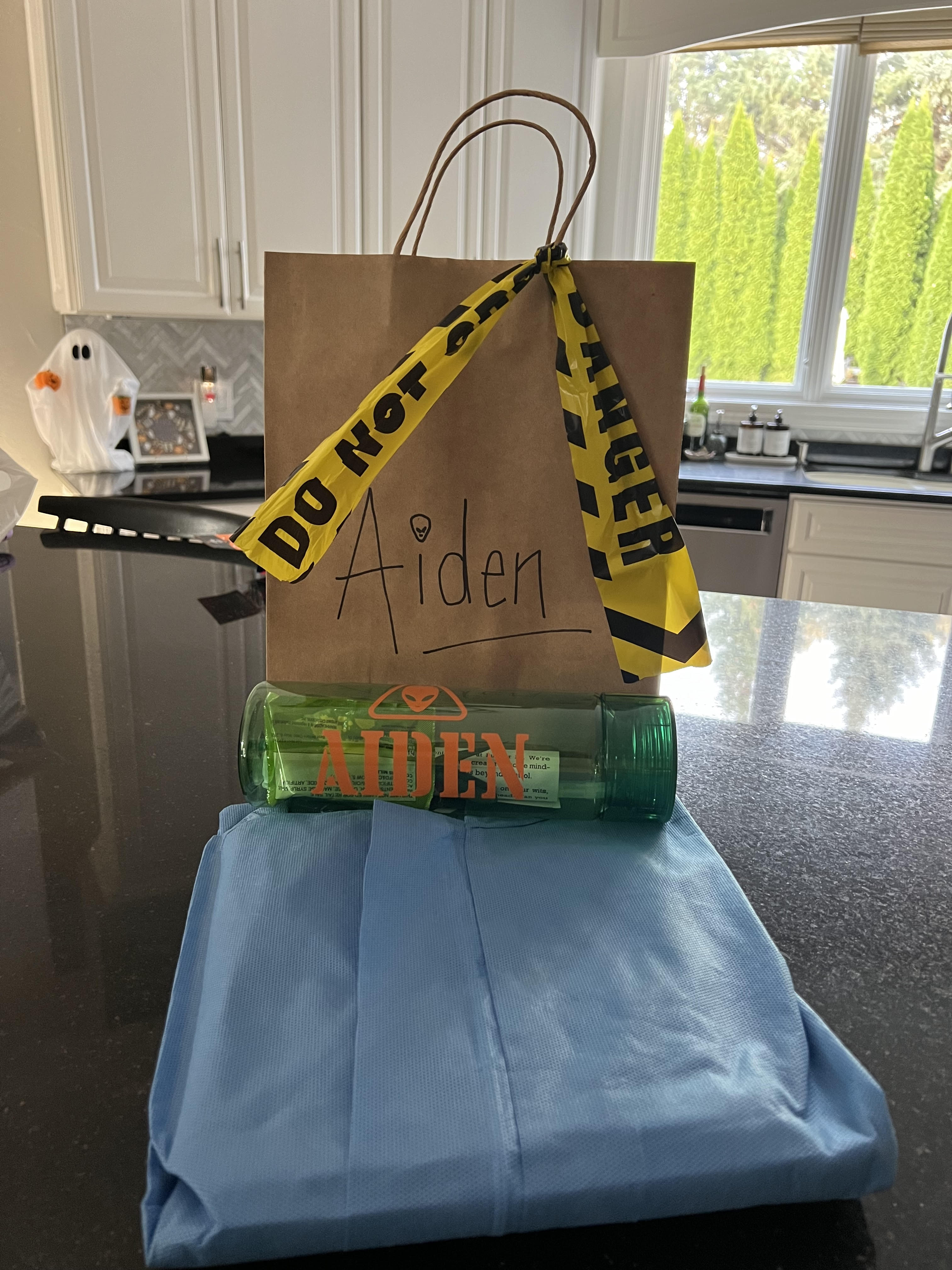 The party experience began before the kids even arrived. Each guest received a paper bag containing a personalized green tube-style water bottle with their name and an alien warning sign on it.